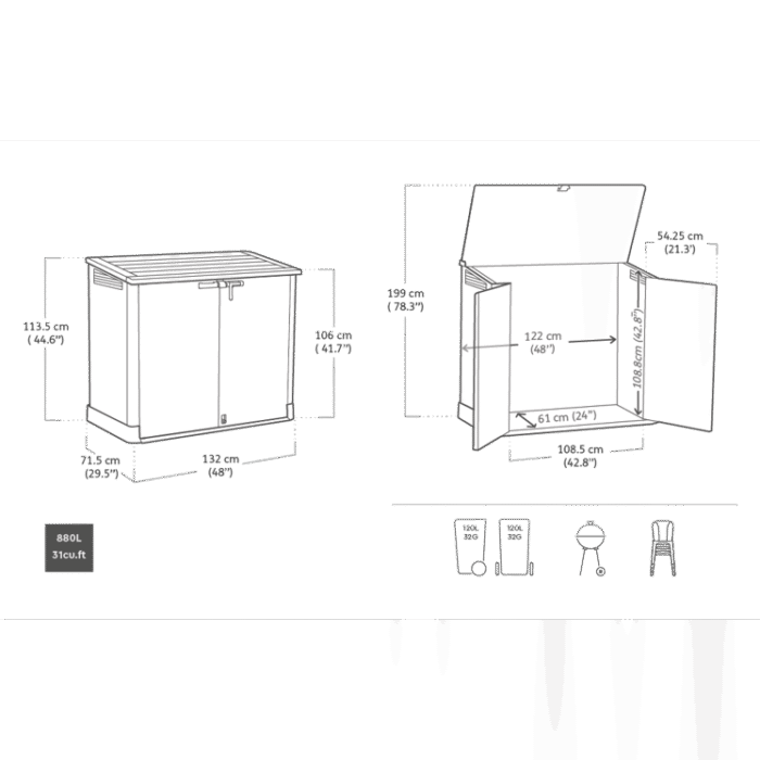 Ideal outdoor storage solution for garden tools and equipment, BBQ and accessories and x 2 120L (SMALL) wheelie bins