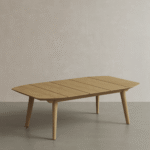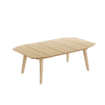 The design, with its clean lines and minimalist form, echoes the timeless appeal of mid-century modern aesthetics, providing a stage for social gatherings that blends retro charm with contemporary ease. Rising to height of 390mm, this table is a study in balanced proportions and fluid lines, crafting an atmosphere of composed grace. The oval surface, arranged in slats, plays with light and shadow, lending the piece an engaging complexity. The gentle tan of the untreated teal is a soft invitation, drawing in those who seek a backdrop of tranquil luxury for their outdoor space.