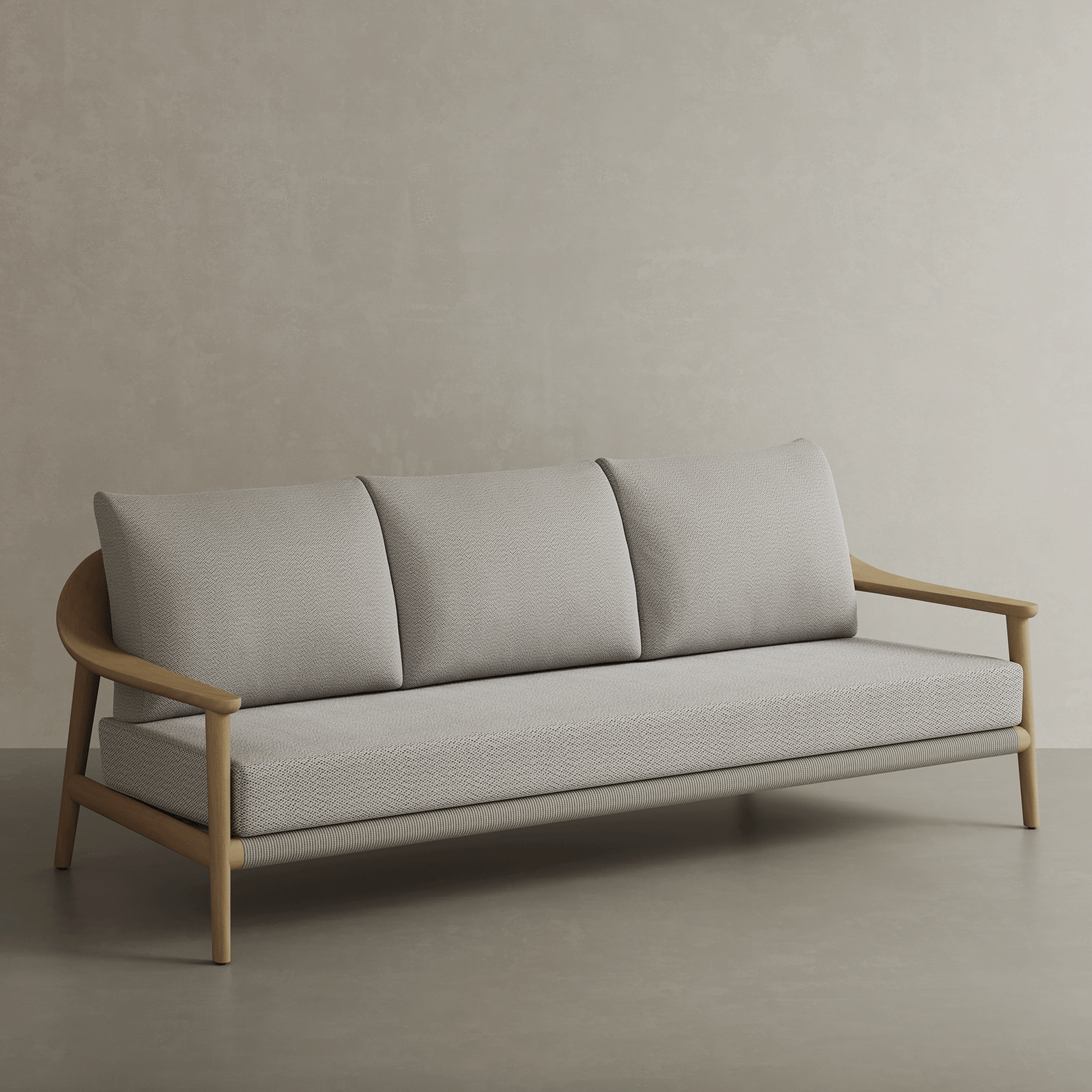 Cushioned with Oatmeal Textured Weave fabric, the expansive seating is an invitation to indulge in comfort and style with friends and family. The fabric’s gentle colour and  texture offer a visual softness that complements the lightness of the wood, creating harmonious grounding. The sofa’s clean lines and the juxtaposed textures of timber, rope and fabric allow for a pleasing composition. This three-seater sofa expands the possibilities for sophisticated outdoor lounging and brings a natural tranquil luxury.